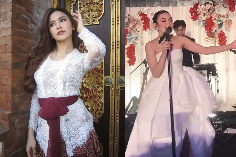 Mahalini atau Mahalini Raharja, 26, tampil anggun dengan gaun putih dan kain kembang dengan perhiasan bertatahkan berlian dilihat seakan-akan pengantin pada malam tersebut.