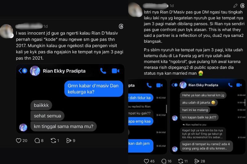 SEORANG pengguna Threads mendakwa menjadi mangsa 'child grooming' atau antunan seksual oleh vokalis kumpulan D'Masiv iaitu Rian Ekky Pradipta. Memetik laporan Suara, individu berkenaan berkongsi tangkap layar mesej peribadi (DM) antara dirinya dengan individu yang dipercayai Rian. Menurut pengguna Threads tersebut, ramai yang menyedari isu child grooming selepas membaca buku Aurelie Moeremans, tetapi tidak ramai yang menyedari Rian D’Masiv turut dikaitkan dengan perlakuan sama.“Banyak orang yang sedar tentang ‘child grooming’ kerana buku Aurelie Moeremans. Tapi pasti tidak ramai yang tahu bahawa Rian D’Masiv juga melakukan child grooming.Perkongsian yang dimuat naik di aplikasi Threads.“Kalau segala hal boleh diselesaikan dengan kata maaf, di dunia ini tidak akan ada penjara ya Mas Rian," katanya. Dalam pada itu, individu terbabit turut memberi amaran dan tidak teragak-agak untuk mendedahkan kelakuan Rian kepada pihak media, namun perkara itu tidak diteruskan. Menerusi tangkap layar perbualan yang dikongsi, Rian dikatakan sempat memohon maaf."Ya, saya minta maaf sekiranya awak tidak berminat," ujarnya. ARTIKEL BERKAITAN: Rian D'Masiv rupanya tak boleh memandu kereta atau motosikal, isteri pula larang ambil lesenARTIKEL BERKAITAN: Insiden hampir disambar api buat Rian D'Masiv trauma, ada rasa takut setiap kali buat persembahanBagaimanapun sehingga kini, keaslian tangkap layar perbualan DM tersebut masih belum dapat disahkan.Selain itu, pemilik akaun turut mendedahkan perlakuan kurang etika Rian terhadapnya yang berlaku di sebuah kelab malam di Bali.“Dipegang-pegang di La Favela Bali. Lepas minta izin balik, dia ajak ke vilanya jam tiga pagi,” tulisnya. Sehingga kini, pihak media Indonesia masih belum dapat menghubungi Rian untuk mendapatkan penjelasan lanjut kerana penyanyi berkenaan tidak memberi respons. Untuk info, ini bukan kali pertama Rian menghadapi tuduhan serius kerana pada 2021 mendiang pemuzik Denny Sakrie turut menuduh Rian melakukan gangguan seksual terhadap anak perempuannya.Rian pada waktu itu bertindak dengan melaporkan akaun tersebut kepada pihak berkuasa, namun perkembangan lanjut mengenai laporan itu masih belum diketahui.Jadilah sebahagian daripada geng mStar! Follow kami di Telegram, Twitter, TikTok, Facebook, Instagram dan YouTube