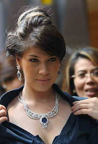 Set persandingan (safir biru dan berlian)berupa rantai berharga RM2.35 juta, anting-anting: RM629,000, gelang: RM74,800, cincin: RM21,000 digayakan oleh jurutari profesional Linda Jasmine. -foto The Star oleh NORAFIFI EHSAN
