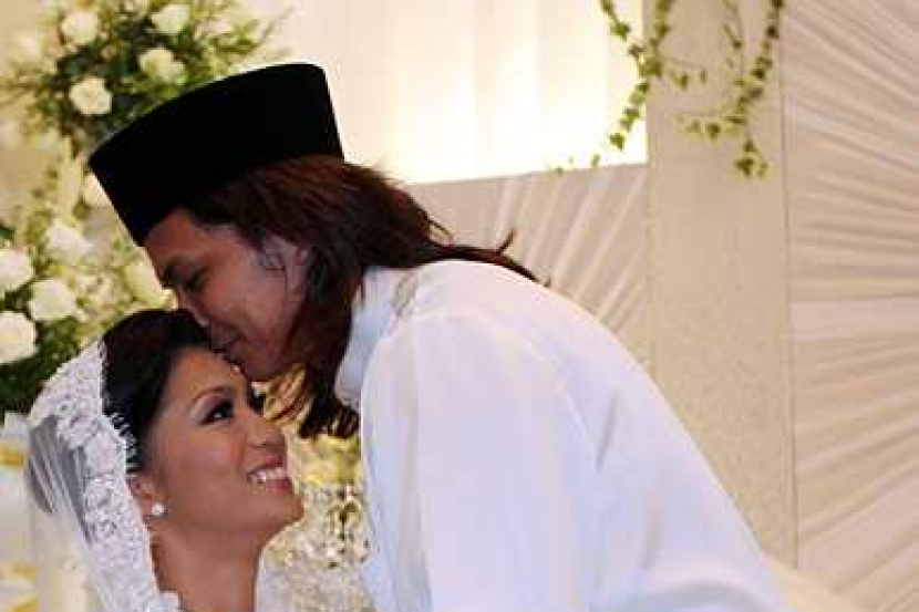 Brian mengucup dahi Nana selepas mereka sah bergelar suami dan isteri. -foto THE STAR Oleh: RAJA HAMDAN ABDULLAH.