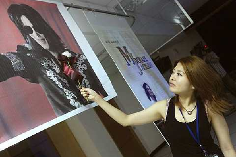 Seorang peminat dari Taiwan mempersembahkan sekuntum bunga ros putih di depan potrait Michael Jackson dalam satu upacara memperingati Raja Pop itu di Taipei, Taiwan pada 5 Julai, 2009. - foto AP