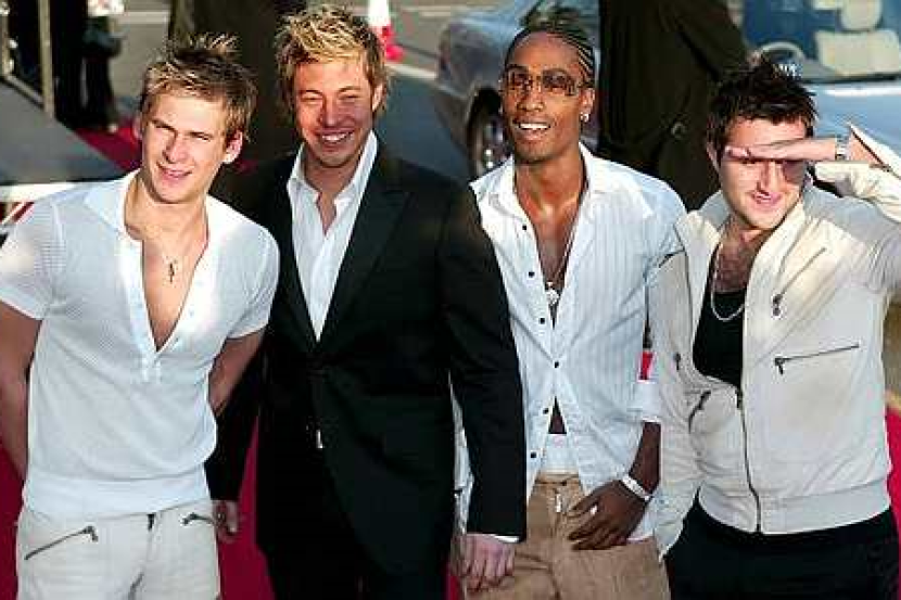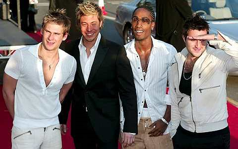 Band lelaki British, "Blue" (dari kiri ke kanan) Lee Ryan, Duncan James, Simon Webbe dan Anthony Costa tiba di The 2003 Brit Awards, London pada 20 Februari 2003. -foto REUTERS