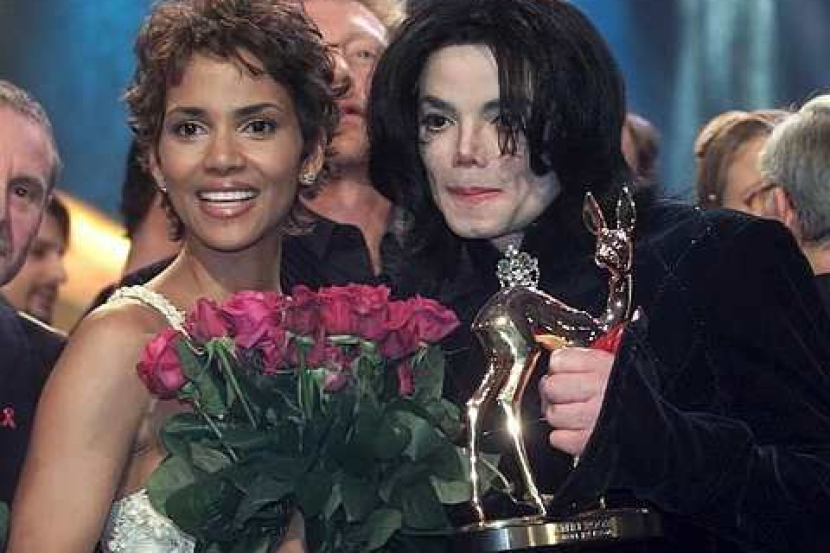 Raja Pop, Michael Jackson (kanan) mempamerkan Anugerah Golden Bambi yang dimenanginya semasa majlis penyampaian anugerah 'Bambi Award' di Berlin pada 21 November 2002. Bersamanya ialah aktres, Halle Berry yang menerima anugerah Bambi dalam kategori Filem Antarabangsa. -foto AP