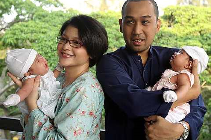 Leya dan Muhammad Ashraf Aasimudin mendukung permata hati mereka, Aza dan Asha. -foto THE STAR oleh SIA HONG KIAU
