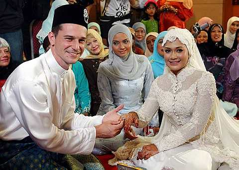 Gavin menyarungkan cincin ke jari manis Serina selepas sah bergelar suami.-Foto The Star oleh SHAARI CHE MATKUALA LUMPUR: Dengan sekali lafaz, aktres jelita Serina Redzuawan sah bergelar isteri kepada Gavin Edward O'luanaigh atau nama Islamnya Salahudin Ghafar pada pukul 11.30 pagi tadi di Masjid Wilayah Persekutuan, Jalan Duta, di sini. Pasangan ini dinikahkan oleh Penolong Pendaftar Nikah, Cerai dan Rujuk masjid tersebut, Mohd. Nazarudin Mohd. Nazir dengan berwalikan bapa Serina, Chef Wan atau Redzuawan Ismail dengan mas kahwin sebanyak RM1,000. Setelah selamat dinikahkan, Serina menzahirkan rasa syukur kerana majlis itu berjalan dengan lancar. "Susah untuk mengambarkan perasaan saya selepas sah bergelar isteri, saya tak percaya sebab ia hanya sekali lafaz sahaja. "Namun apa yang dapat dirasakan ialah Gavin melafazkan akad dengan ikhlas dan hati saya sangat tersentuh."Ini juga bermakna bermula satu tanggungjawab besar kepada saya untuk membimbing suami sebagai seorang Muslim. "Saya bukanlah pandai fasal agama tapi Insya-Allah, saya akan sama-sama mencuba yang terbaik mempelajari ajaran Islam. "Saya sangat berharap perkahwinan kami akan kekal ke akhir hayat," kata Serina yang akan berbulan madu di Pulau Santorini, Greece.Sementara itu, Gavin mengakui perasaan gemuruh dan gembira bercampur baur ketika melalui upacara akad nikah sebentar tadi.Katanya, dia sangat gembira kerana berjaya melepasi satu tahap baru dalam hidupnya dan hari ini merupakan satu pengalaman baru yang tidak akan dilupakan sepanjang hayat.Ketika ditanya tentang harapan menimang cahaya mata, Serina memberitahu bahawa dia inginkan dua pasang anak lelaki dan perempuan bagi melengkapi kehidupan rumah tangganya.Pada majlis itu, Serina menerima tujuh dulang hantaran termasuk wang hantaran berjumlah RM30,000 dan membalas kepada Gavin dengan sembilan dulang hantaran.Antara barang hantaran yang diberi pihak Gavin kepada Serina terdiri dari sepersalinan baju, kain telekung, beg tangan, gelang tangan, cek bernilai RM30,000, Al Quran dan kek serta sirih junjung.Manakala Gavin menerima Al-Quran, Telefon bimbit, tali leher, jam tangan, kemeja, minyak wangi, tali pinggang, kek dan sirih junjung.Pasangan pengantin ini akan diraikan dalam majlis berinai besar pada malam ini di NEO, Jalan Sultan Ismail sebelum melalui majlis bersanding di The Royale Chulan malam esok.
