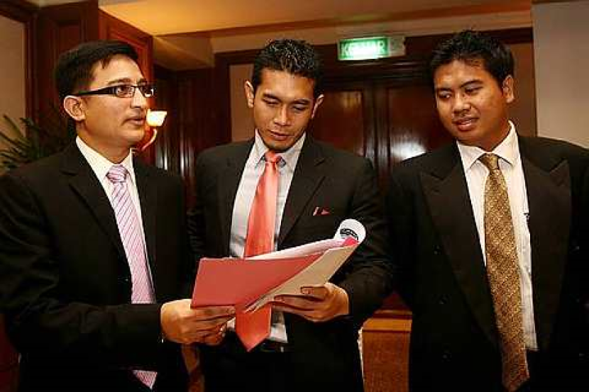 Fahrin (tengah) bersama peguamnya Tengku Naufal Tengku Mansor (kiri) pada sidang media notos tuntutan terhadap bekas kekasihnya Linda Onn. Foto The Star Oleh BRIAN MOH