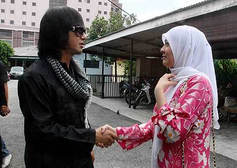 Radhi hadir mengenakan baju Melayu rona hitam dan berselendang putih manakala Shazlin memakai baju kurung merah jambu dan bertudung putih.