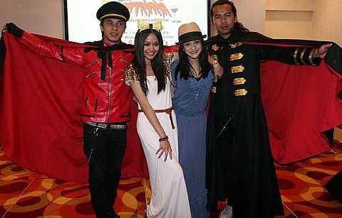 Sufian (kanan) bersama-sama para pelakon Tolong! Awek Aku Pontianak iaitu Zahiril (kiri), Liyana Jasmay dan Sazzy Falak ketika ditemui di Menara Kuala Lumpur. - Foto LOW BOON TAT
