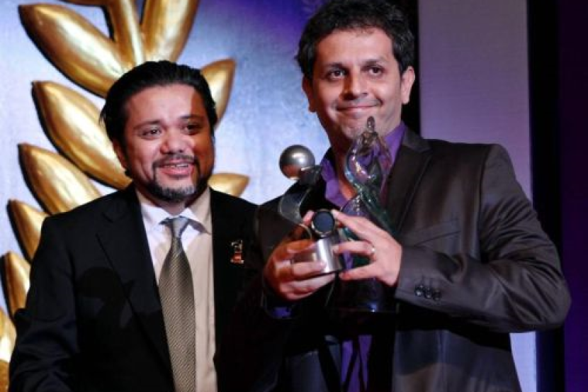 Ketua Pengarah Perbadanan Kemajuan Filem Nasional Malaysia (Finas) Mohd Naguib Razak (kiri) menyampaikan hadiah kepada pengarah filem Kabir Bhatia yang menang besar menerusi enam kategori termasuk filem dan pengarah terbaik pada malam Anugerah Profima 2011 di Dewan Merdeka, Pusat Dagangan Dunia Putra di sini, malam Ahad lalu. - Foto SHAARI CHE MAT
