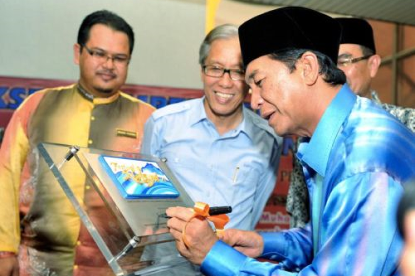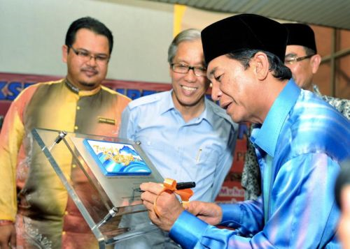 Menteri di Jabatan Ketua Menteri Datuk Nasir Tun Sakaran (kanan) menurunkan tandatangan pada plak sebagai simbolik perasmian Festival Nasyid Kebangsaan (FNK) kali Ke-22 di Wisma Muis di sini. Turut sama, Pengarah Jabatan Hal Ehwal Agama Negeri Sabah (JHEAINS) Datuk Amri Suratman (dua dari kiri). Foto BERNAMA.