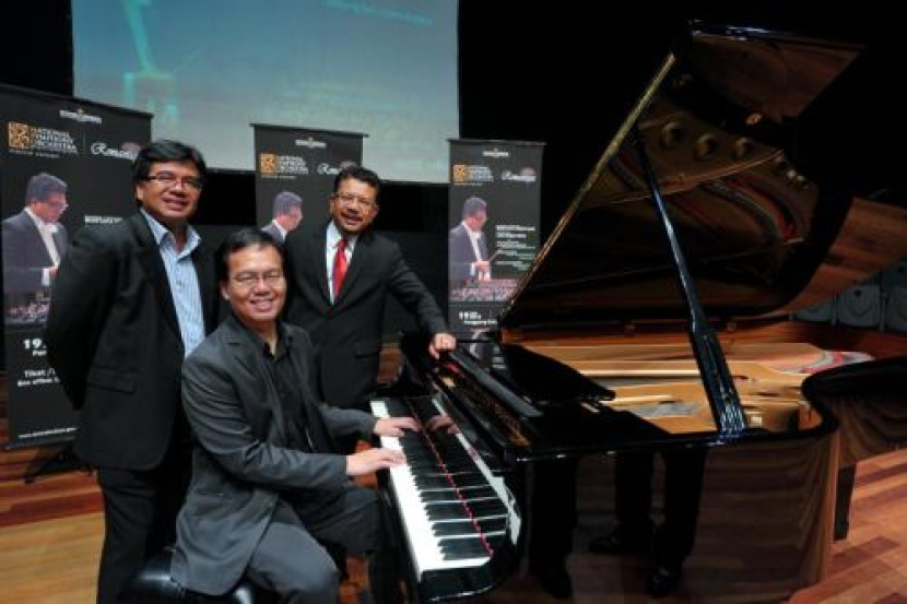 Mohamed Juhari Shaarani (kanan) bersama Konduktor Muzik Okestra Simfoni Kebangsaan, Mustafa Fuzer Nawi (kiri) dan pemain solo piano tempatan, Loo Bang Hean pada pelancaran Konsert Klasikal OSK Romantique pada Selasa. - Foto UTUSAN