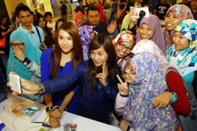 PETALING JAYA: Seramai lima selebriti tempatan iaitu Farid Kamil, Yana Samsudin, Intan Ladyana, Siow Hui Mei dan Jason Phang terlibat mempromosikan gajet terbaharu daripada Samsung Malaysia Electronic iaitu Galaxy Note 3 dan Galaxy Gear di pusat beli belah One Utama di sini pada Sabtu.