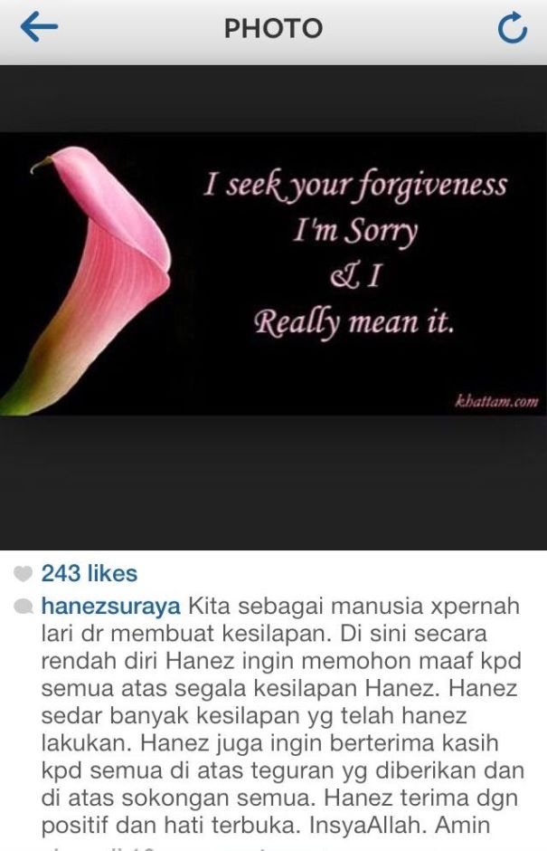 "Kita sebagai manusia tidak pernah lari daripada (melakukan) kesilapan, secara rendah diri Hanez ingin memohon maaf kepada semua atas segala kesilapan Hanez.