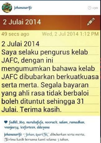 PETALING JAYA: Pelakon Johan As'ari menafikan kelab peminatnya iaitu Johan As'ari Fan Club (JAFC) yang ditubuhkan sejak tiga tahun lalu dibubarkan gara-gara mempunyai masalah dalaman seperti yang diperkatakan beberapa pihak. Johan, 28, berkata, JAFC bukan mahu dibubarkan sebaliknya pengurus kelab berkenaan ingin meletakkan jawatan atas urusan peribadi dan tempatnya akan digantikan oleh ahli-ahli lain. "Sehingga kini saya tidak pernah mempunyai sebarang masalah dengan kelab peminat JAFC. Setiap tahun kami menjalani pelbagai aktiviti riadah bersama. "Mungkin orang salah faham dengan kenyataan pengurus JAFC kerana dia seorang sahaja yang tidak akan terlibat dengan kelab itu lagi. Tetapi JAFC tidak dibubarkan," katanya yang dihubungi mStar Online pada petang Khamis. Johan diminta mengulas mengenai status yang dimuat naik di akaun Instagram milik JAFC membuat pengumuman bahawa kelab tersebut akan dibubarkan serta merta pada Rabu lalu. Status pembubaran JAFC yang dimuat naik pengurus kelab tersebut. Malah pengurus kelab berkenaan turut meminta ahli-ahlinya untuk menuntut bayaran ahli sehingga 31 Julai ini. Keadaan itu menimbulkan persoalan di mana berkemungkinan besar Johan mempunyai masalah dalaman dengan kelab peminat berkenaan. Ditanya sekali lagi kepada Johan mengenai kenyataan yang dikeluarkan oleh pengurus JAFC, Johan berkata pengurus itu mungkin tidak tahu menggunakan laman sosial berkenaan sehingga membuat kenyataan yang menimbulkan persoalan kepada para peminatnya. "Entahlah, dia (pengurus JAFC) tidak tahu menggunakan Instagram kut," ujarnya. Sementara itu, mengenai perkembangan isu pendapatannya yang disekat selepas Zizan Razak yang juga pengarah syarikat pengurusannya, Wire Fame Entertainment Sdn Bhd, Johan berkata, sehingga kini dia masih lagi belum menerima bayarannya. "Saya harap sangat masalah Wire Fame dapat diselesaikan segera kerana saya memerlukan wang saya itu secepat mungkin. Lebih-lebih lagi Hari Raya dah nak dekat, banyak keperluan yang perlu dibelanjakan," tuturnya.