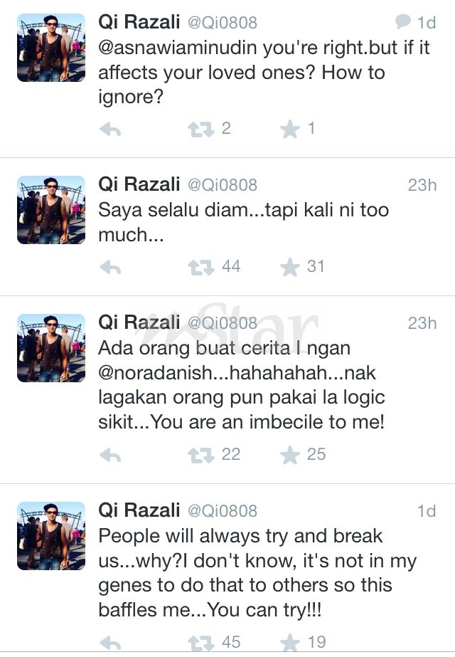 Qi berkata demikian ketika diminta mengulas tentang statusnya di laman Twitter pada Isnin lalu yang berang dengan tindakan seorang pengikut di laman Twitter kerana menyebarkan fitnah iaitu khabar angin tentang dirinya mempunyai hubungan dengan pelakon Nora Danish.