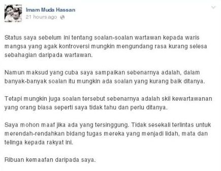 Permohonan maaf yang dibuat Hassan menerusi laman Facebooknya.