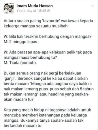 Status itu menimbulkan rasa kecewa pengamal media yang terpaksa bekerja untuk memberi liputan terbaik agar orang ramai mendapat gambaran sebenar termasuklah luahan hati keluaga mangsa.