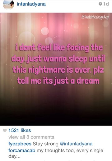Malah rata-rata peminat memberi sokongan dan meminta Intan supaya bersabar dengan apa juga dugaan yang sedang dilaluinya sekarang.