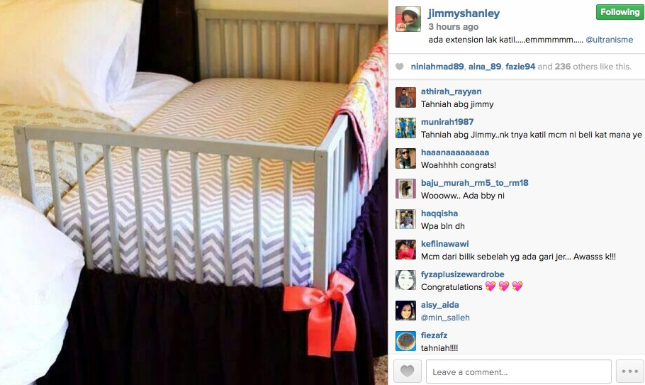 Selasa lalu, Jimmy menerusi laman sosial Instagram telah memuat naik sekeping foto sebuah katil bayi yang disambungkan ke katil dewasa dengan kapsyen "Ada extension plak katil...ermmm".