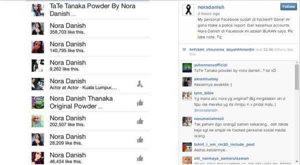 Dalam pada itu, Nora turut menyenaraikan 10 lagi akaun Facebook palsu yang menggunakan namanya. Jelas Nora, dia berharap peminat tidak akan mengambil perhatian dan tidak tertipu dengan akaun palsu tersebut.