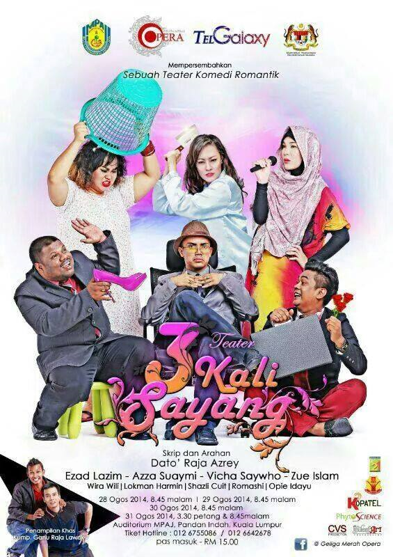 Baru-baru ini, sebuah poster teater 3 Kali Sayang yang bakal dipentaskan pada 30 Ogos ini di Auditorium MPAJ Pandan Indah telah dikeluarkan untuk tujuan promosi.