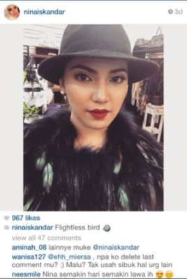 Dalam pada itu, Nina turut ditanya tentang gambar yang dimuat naik di laman Instagram menerima kritikan pengikutnya yang menuduh dia sudah tidak bertudung.