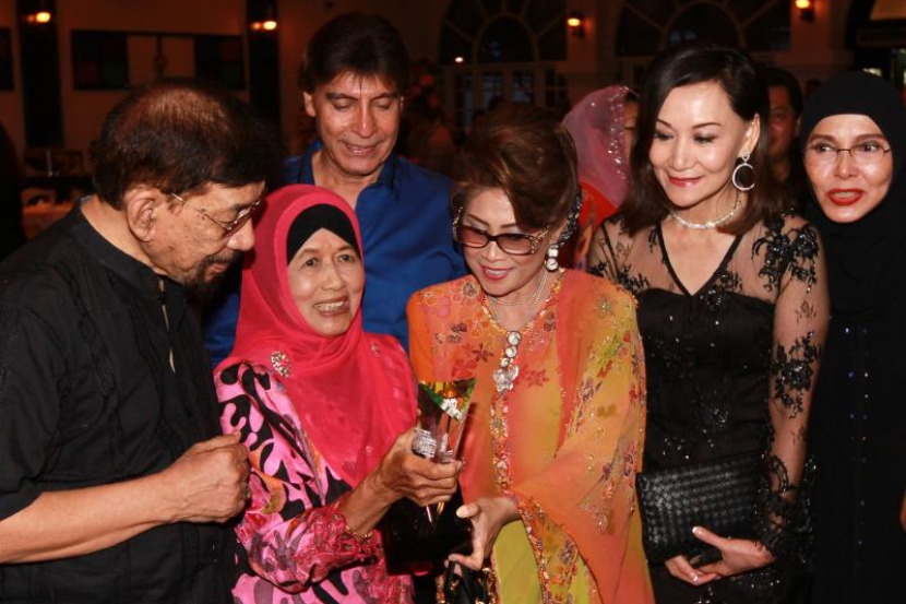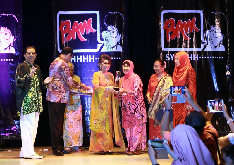 Puan Sri Masnah Rais menyampaikakn anugerah tribute kepada Bahyah Mahmod (tiga dari kiri) sambil disaksikan rakan-rakan artis.