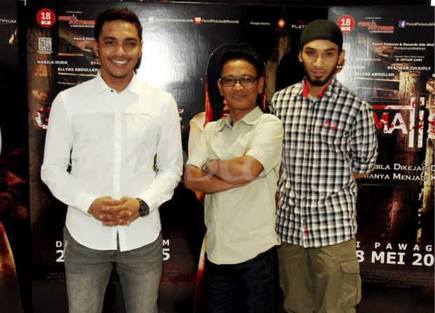 Wan Elyas bersama pengarah Hitler Zami (tengah) dan Syazwan Zulkifly (paling kiri) pada majlis tayangan perdana filem Gamatisme.