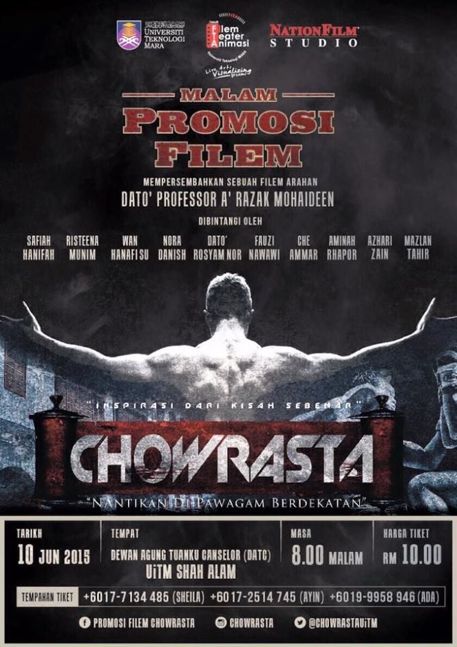 Malam Tayangan Promosi Filem Chowrosta ini dianjurkan FiTA, UiTM dan akan berlangsung pada pukul 8 malam di Dewan Agung Tuanku Canselor (DATC), UiTM Shah Alam.
