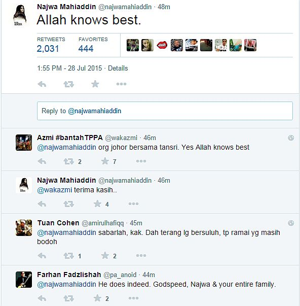 Dalam status Twitter miliknya, Najwa turut mengucapkan terima kasih kepada peminat yang memberikan komen dan melahirkan sokongan kepada bapanya itu.