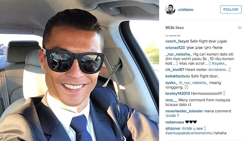 Foto Ronaldo berbaju kot itu sehingga Rabu mendapat lebih 952,000 likes dan lebih 10,439 komen termasuklah daripada peminat Malaysia yang ingin mencari komen Siti Nurhaliza.