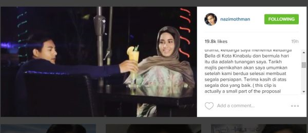 Nazim atau nama sebenarnya, Nushrul Alif Othman, 32, menerusi laman sosial Instagramnya pada Jumaat berkata, dia melamar pelakon wanita itu ketika menjalani penggambaran drama Akulah Balqis di Langkawi, Oktober tahun lalu.