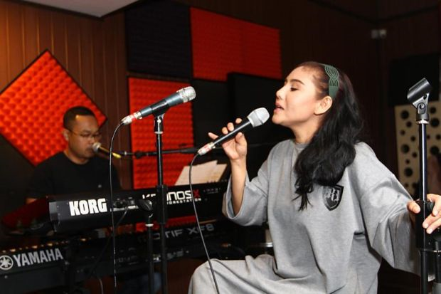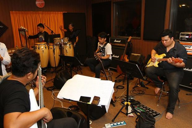 Pemuzik sedang yang bakal mengiringi persembahan penyanyi giat mengadakan latihan.