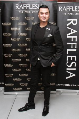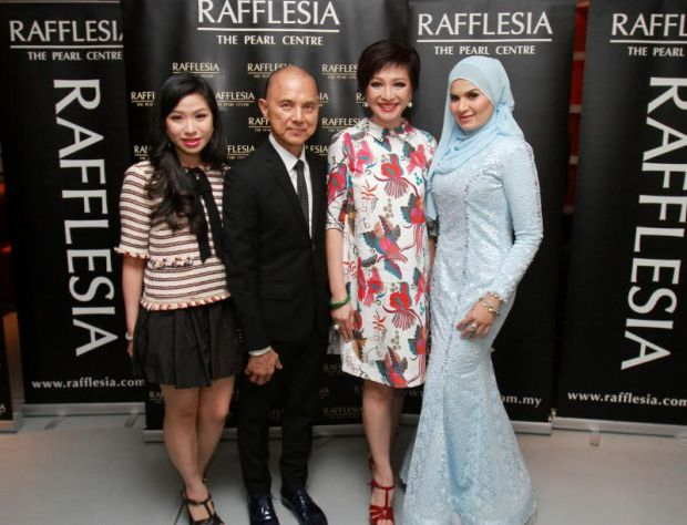 Pereka kasut terkenal dunia, Datuk Jimmy Choo bergambar kenangan bersama Pengurus Pemasaran Rafflesia The Pearl Centre iaitu Sin Hui Cin, Pengarah Urusan Rafflesia The Pearl Centre, Winnie Sin dan Pengasas produk Dnars, Faziani Rohban.