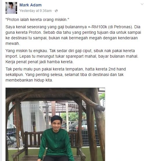 Terdahulu, pada Rabu terdapat laman sosial Facebook yang menggunakan nama Mark Adam telah menimbulkan kemarahan orang ramai apabila merendah-rendahkan kualiti kereta buatan Malaysia.Facebook palsu itu turut menulis bahawa kereta jenama Proton hanya dipakai oleh golongan yang tidak berkemampuan sahaja.