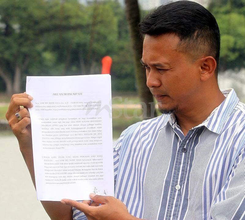 Azmi Hatta menunjukkan akuan bersumpah yang mengandungi 45 perkara mengenai rumah tangganya sebelum ini.
