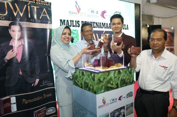 Penasihat Pembangunan Keusahawanan dan Ikhtisas Wanita di Jabatan Perdana Menteri, Tan Sri Shahrizat Abdul Jalil (kiri), Menteri Pertanian dan Industri Asas Tani, Datuk Seri Ahmad Shabery Cheek, Nubhan dan Ketua Pengarah Jabatan Perikanan, Datuk Ismail Abu Hassan pada majlis pelancaran produk Juwita Divine.