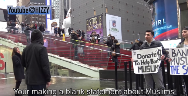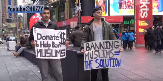Berdasarkan video eksperimen sosial yang dimuat naik di Youtube sejak dua minggu lalu, dua lelaki berkenaan memegang plakad meminta orang ramai menderma bagi menghalang kemasukan umat Islam ke negara Uncle Sam itu.Seorang lagi lelaki pula memegang plakad yang tertulis "larangan terhadap orang Islam adalah jalan penyelesaian".