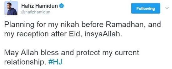 Hafiz atau Mohammad Hafiz Hamidun dihubungi bagi menjelaskan mengenai statusnya di Twitter beberapa hari lalu yang mengumumkan dia akan berkahwin.