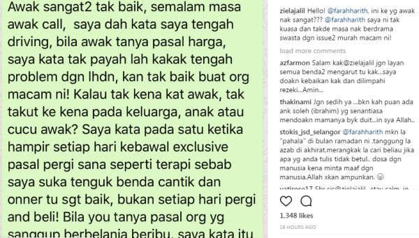 "Pemilik Bawal Exclusive selalu menaja saya dengan tudung-tudung dia yang berharga beribu, bukan saya beli. Saya kata ada semua warna yang plain berharga RM30 atau RM40 sahaja," tulisnya.