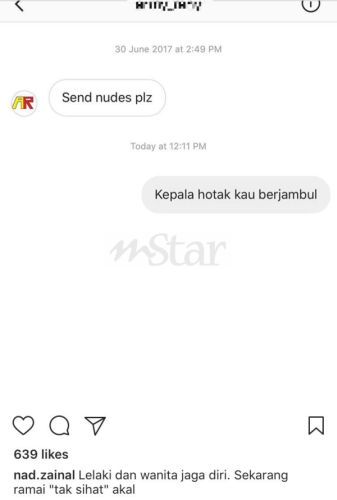 Status yang dimuat naik itu mendapat reaksi positif pengikutnya yang menyokong tindakan Nad membalas mesej berkenaan.