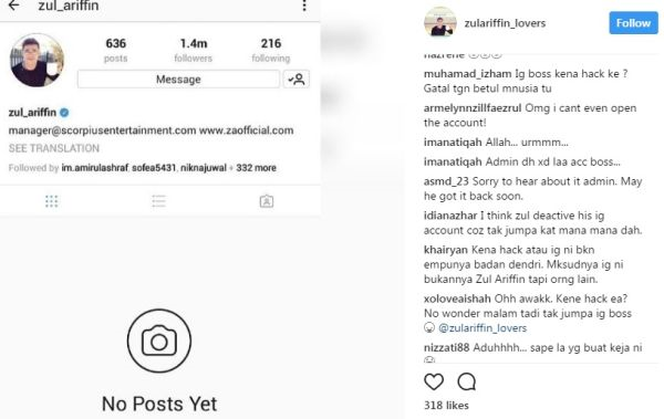 Akaun Instagram peminat Zul Ariffin yang kecewa tidak dapat mengikuti perkembangan aktor itu.