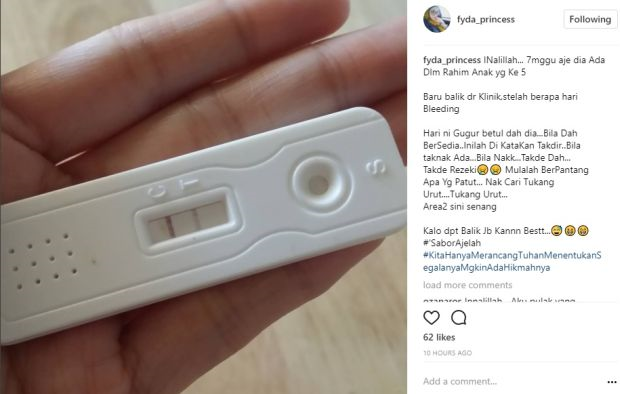 Berita sedih ini dikongsi sendiri oleh Fyda, 36, menerusi sekeping gambar alat ujian kehamilan yang dimuatnaik di laman Instgramnya pada Rabu.