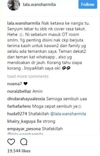 Sementara itu, Wan Sharmila tidak dapat memberi maklumat lebih lanjut mengenai hal itu dan dia mengucapkan terima kasih kepada peminat yang mendoakan kesihatannya.