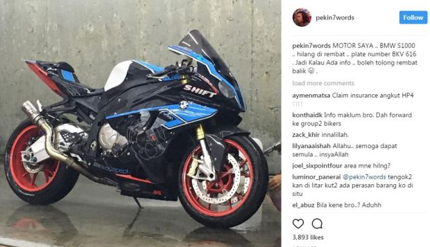 "Motor saya. BMW S1000. Hilang 'dirembat'. Plate number BKV 616. Jadi kalau ada info, boleh tolong 'rembat' balik," tulis pekin.