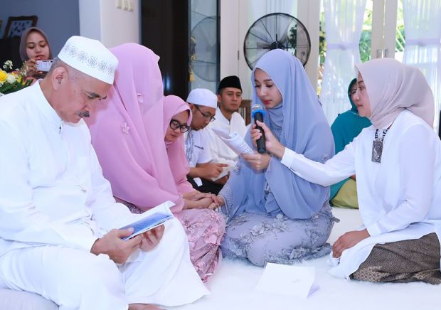 Dengan linangan air mata, dia juga dilihat memohon restu daripada orang tuanya. Tampil dengan balutan busana muslimah rona ungun bunga-bunga, pelakon filem Surga Yang Tak Dirindukan ini tampak begitu manis dengan persalinan berkenaan.