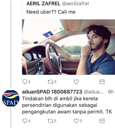 TINDAKAN Aeril Zafrel memuat naik foto di laman Twitter dengan status Need Uber? Call Me (perlukan uber, sila hubungi saya) mendapat maklum balas daripada pihak Suruhanjaya Pengangkutan Awam Darat (SPAD).