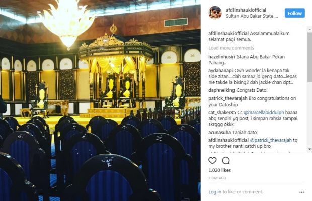 PELAKON Afdlin Shauki dianugerahkan darjah kebesaran sempena Ulang Tahun Keputeraan Sultan Pahang, Sultan Ahmad Shah pada Selasa.