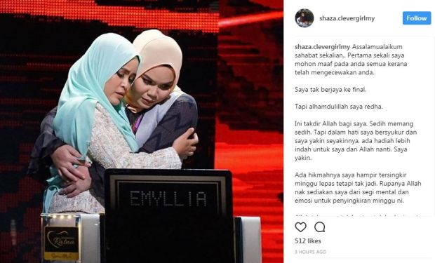 Menerusi kapsyen yang dimuat naik di Instagram miliknya, Shaza atau nama sebenarnya Nurul Shazalina Zainudin, 30, berkata, dia reda dengan keputusan disingkirkan biarpun sudah berusaha untuk menjuarai program tersebut.