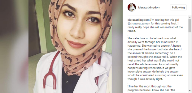 Bercakap menerusi Instagram, Kiera menjelaskan Shazana bukan 'rabbit' dimaksudkannya sebelum ini namun wanita itu antara seorang yang pintar dan layak menjuarai pertandingan itu.